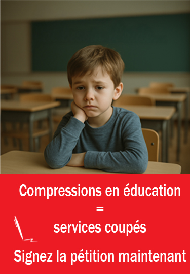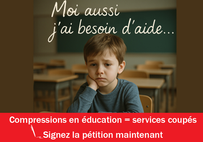 Cette pétition a été initiée par la FPSS-CSQ et parrainée par Pascal Bérubé, député de Matane-Matapédia. Elle demande au gouvernement de ne pas procéder à des restrictions budétaires en éducation et préserve les services directs aux élèves.